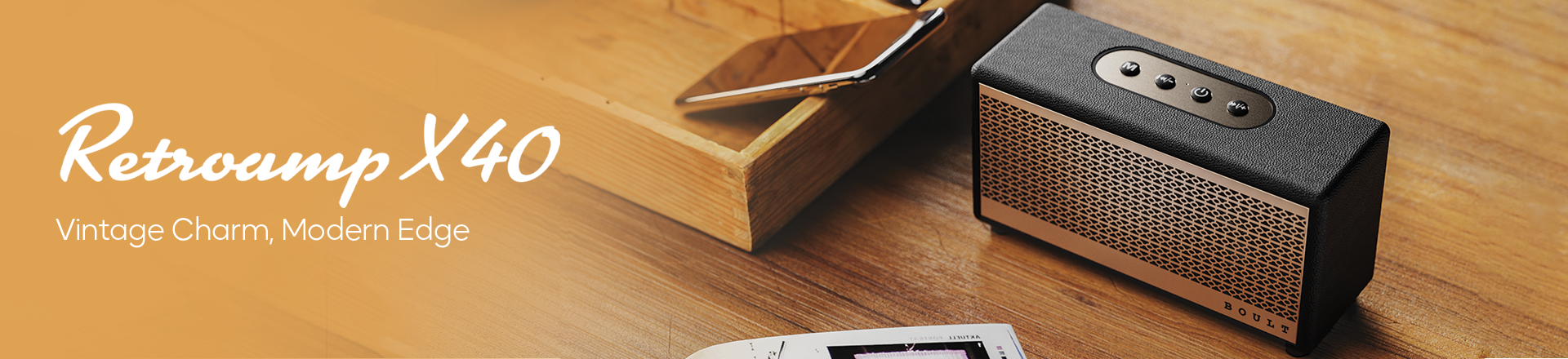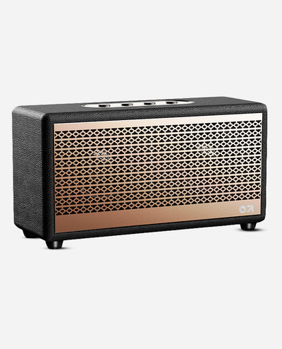 GOBOULT RetroAmp X40, a sleek speaker featuring a Classic Rugged Leather Body in Vintage Gold with a RoseGold Metal Grill. Powered by Dual Dynamic Drivers and BoomX Technology, this 40W speaker delivers deep, studio-quality bass. Enjoy multiple modes like Bluetooth, FM, and Karaoke singing, all supported by the latest Bluetooth 5.3 with EDR. The RetroAmp X40 offers versatile input options including AUX, USB, TF card, and Type C power input, making it compatible with Smart TVs, computers, laptops, mobiles, and more. The Master Control Panel with intuitive controls allows you to easily manage your music. Perfectly blending classic design with modern functionality, its your go-to speaker for every occasion.
